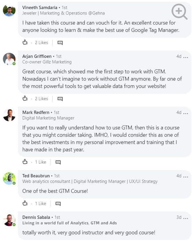 “Julius is a great teacher and this course will equip you with a solid foundation for effectively working with GTM. His pleasant way of explaining complex topics make this course accessible for many. I recommend this course for both beginners as well as intermediate users. After going through the material and practicing what you have learned, you will be much more confident in deploying GTM on your site.”