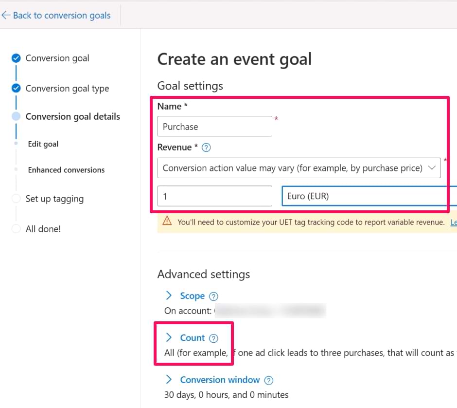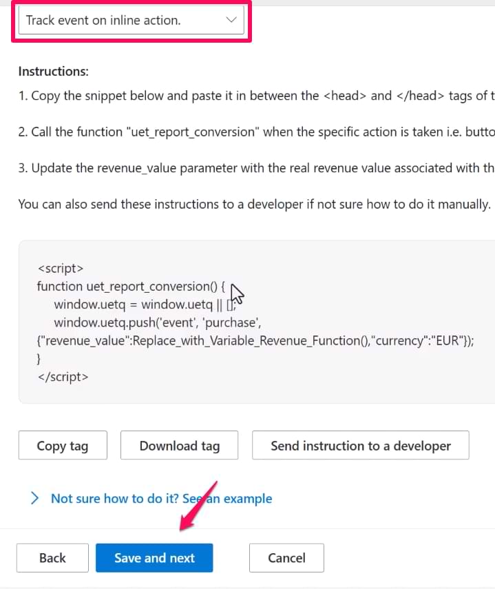 - Use the same UET tag ID that you used in the Page view tracking setup