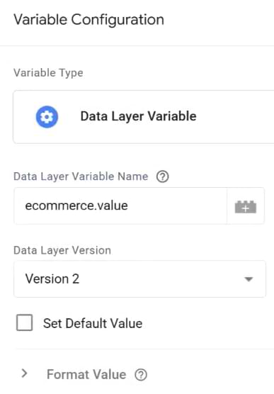 - In the Revenue value, we’ll need to insert the variable that takes the revenue from the data layer.