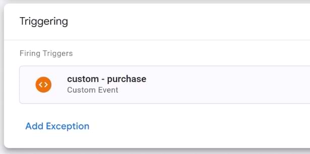 In the triggering section, click anywhere and select the Custom Event trigger that you’ve created in the previous chapter. Save the tag.