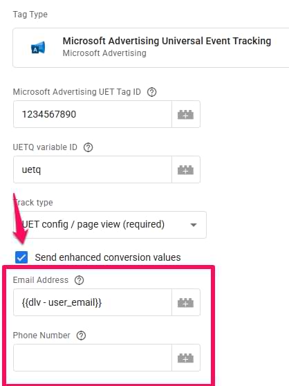 In that case, the setup is more straightforward. Open your UET pageview tag and click the “Send enhanced conversion values” checkbox, and two fields will appear (Email address and Phone number).