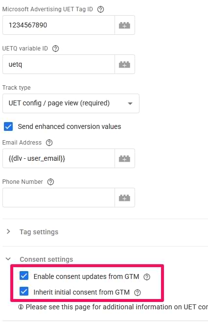 However, the good news is that if you have already implemented Google’s consent mode on a website. Microsoft UET tags can reuse your existing Google Consent Mode setup. All you need to do is enable “Consent settings” in the UET pageview tag.