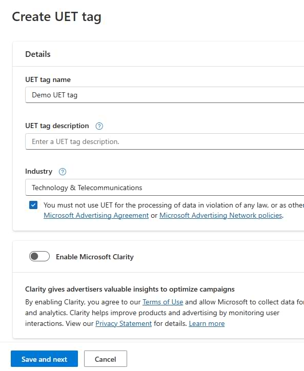Click Next. And that’s it! You have now created a UET tag.
