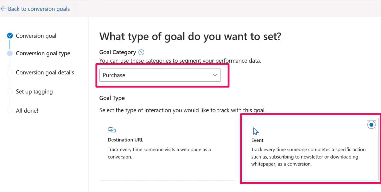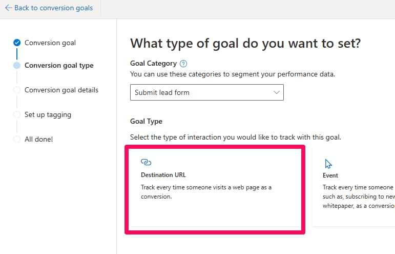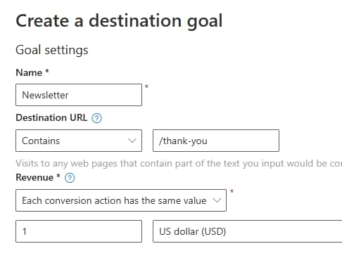 If you can distinguish (just by looking at the page URL) that a visitor completed an important action, you can create destination URL conversion goals. All you need to do is add the Page view Microsoft Ads UET tag. Bing ads will handle the rest once you configure the goal.