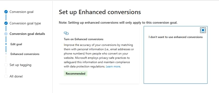 P.S. I will explain how to handle enhanced conversions later in this article. For now, I left the checkbox unchecked.