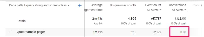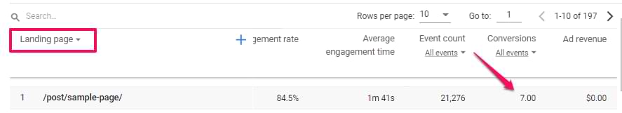 But, if I check the same page in the Google Search Console Landing page report within GA4, I see that seven confirmed_email_optin conversions are counted for that regular blog post.