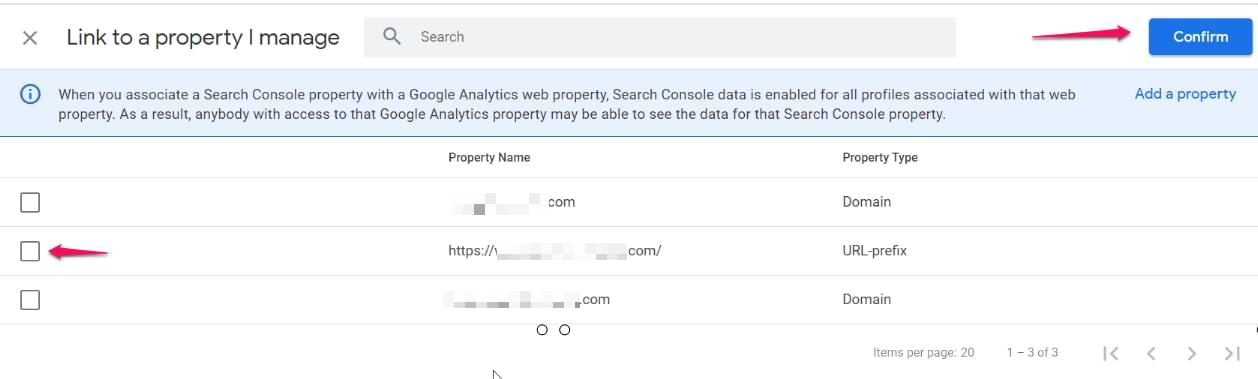 A new list of properties where you are a verified site owner will appear. Choose one property and then click Confirm. You can link only one GSC property with one GA4 property/web stream.