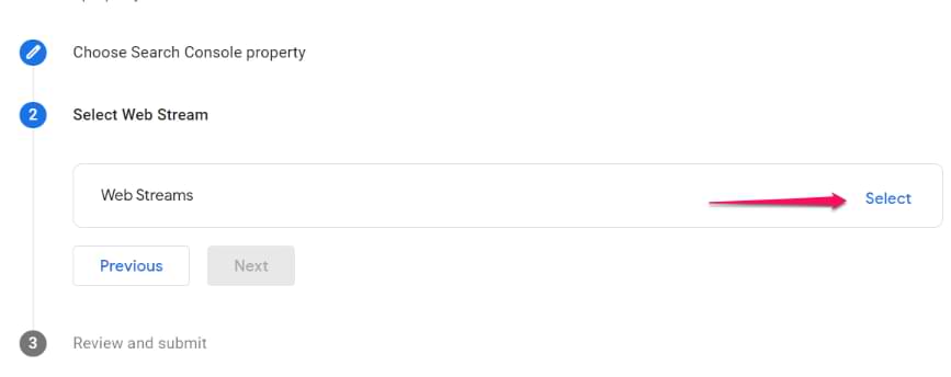 Then you will need to select a web stream you want to link with that Search Console property. Click Select and then choose the stream.