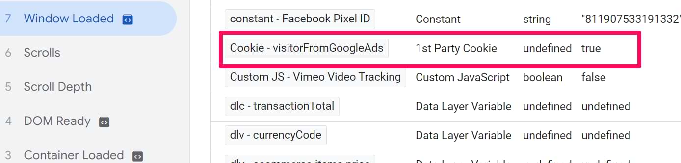 This variable searches for cookies with the title visitorFromGoogleAds. If it spots one, GTM will read its value and make it available in the Variables tab of the Preview and Debug console.