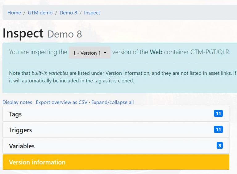 Get started by clicking the GTM Account dropdown in the top menu bar and choose the account from which you want to copy/export something. In my case, it’s a mysterious website called Demo 8.