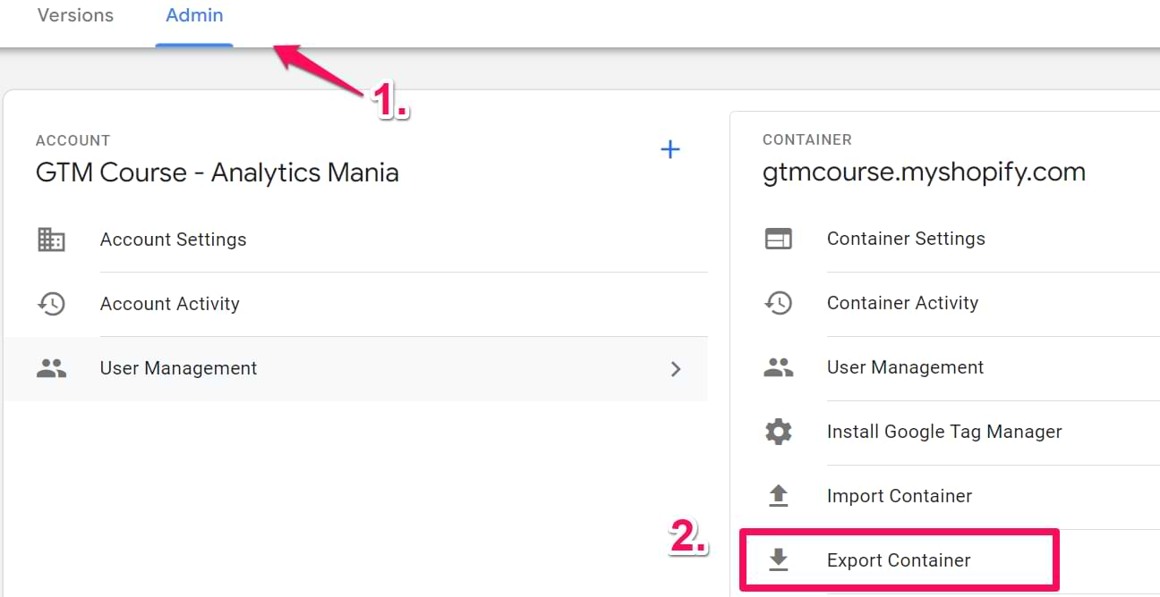 But if you have already created a separate Google Tag Manager container to make it a template, go to its Admin section (1) and choose Export Container (2) in the Container column.