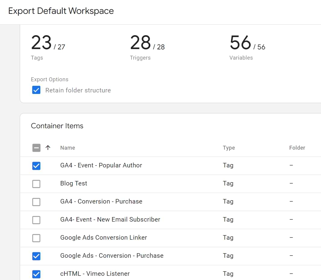 And you’ll see the container assets. Choose the ones that you want to export, whether it be tags, triggers or variables.