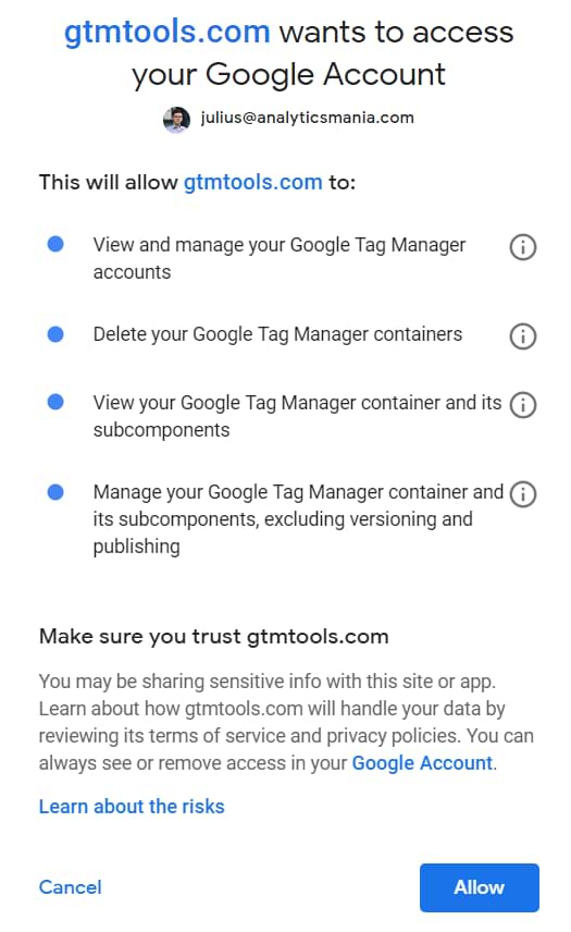 You’ll be asked to give access permission to various things in Google Tag Manager.
