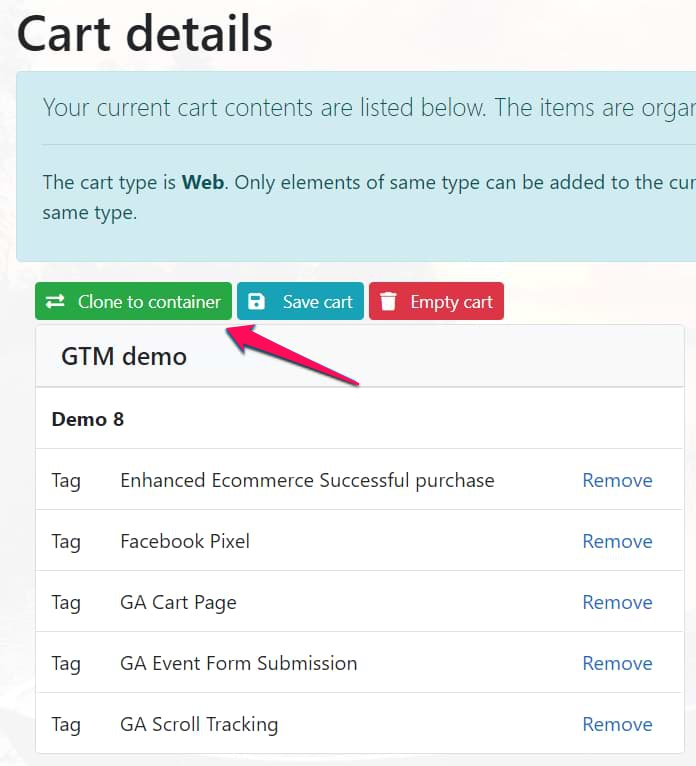 We’re getting close. Let’s clone everything from the cart to the target GTM container; click the green Clone to Container button.
