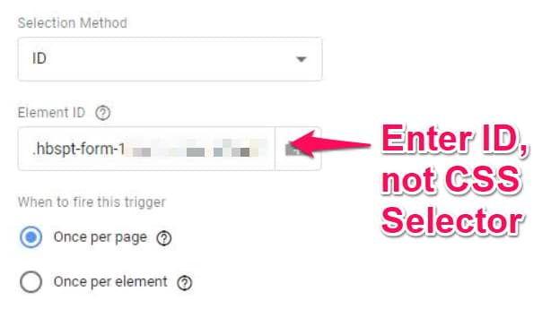 Another example of a common mistake is when GTM users select the ID selection method but try to enter CSS selector in the field below.