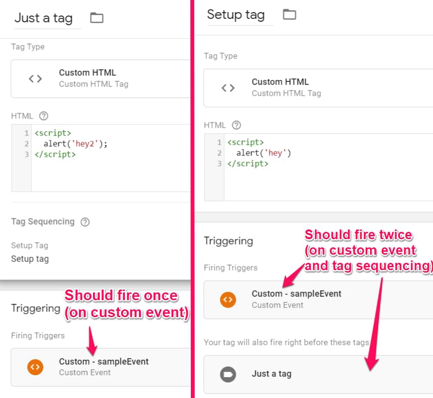 - and also Tag Sequencing from “Just a tag” will activate the “Setup tag”, hence the tag will fire twice on the same dataLayer.push event.