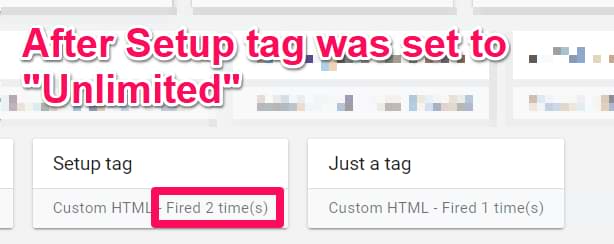 But if you changed the “Setup Tag’s” tag firing option to Unlimited, that tag would have fired twice on the same sampleEvent.