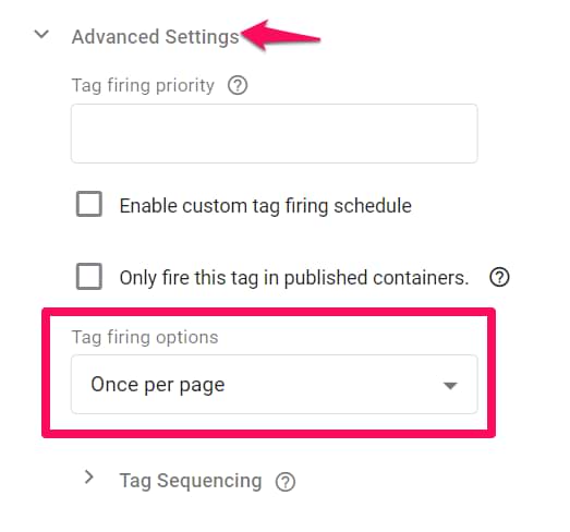 You will see many options if you open any tag in Google Tag Manager and click Advanced Settings. One of them is the Tag Firing Options drop-down. Thanks to this field, you can configure how many times your tag will fire: Once per Event, Once per Page, and Unlimited.