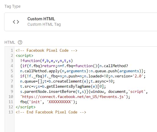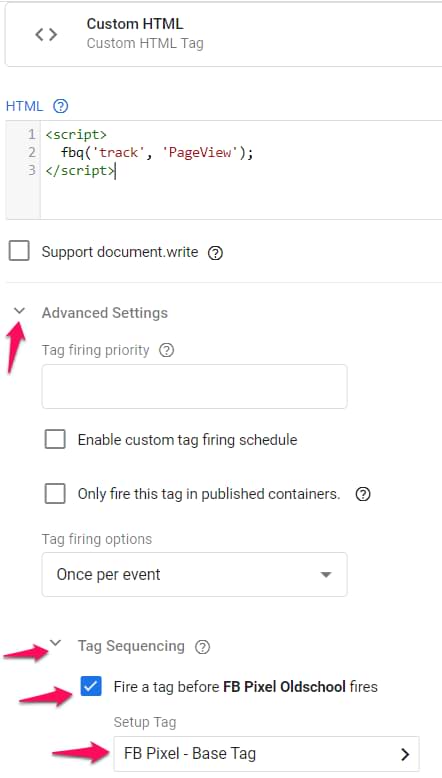 The important thing here is to ensure that the Facebook Pixel base code (the main code) is set to Fire once per page. And you can do that on the level of that Custom HTML tag.