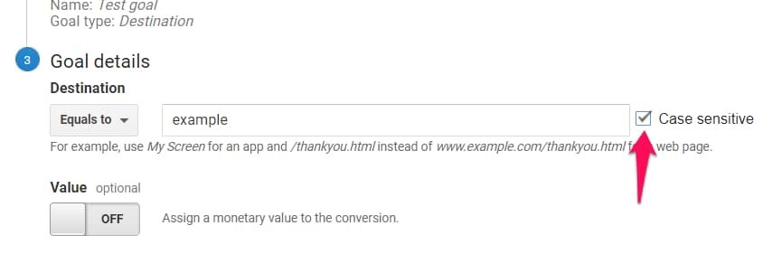 If you choose “Begins with” match type, then the goal will care only about the beginning of a string (text) you are trying to match, e.g. /pages/thankyou will match both /pages/thankyou and /pages/thankyou/ (with the trailing slash). Based on my tests, begins with also isn’t case-sensitive (unless that “Case sensitive” checkbox is selected).
