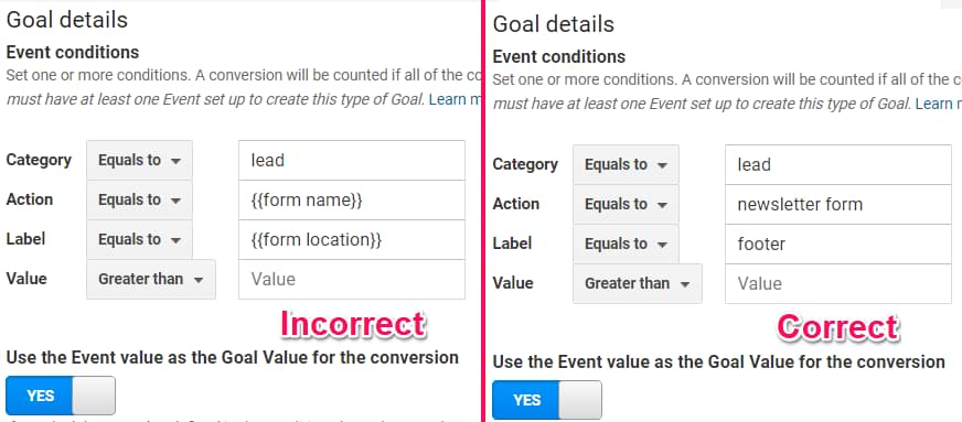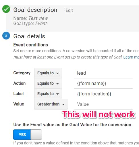 Why are those words surrounded by curly braces? Because some beginners enter Google Tag Manager variable names in Goal’s settings. Unfortunately, that will not work because Google Analytics has no clue what variables are within GTM.