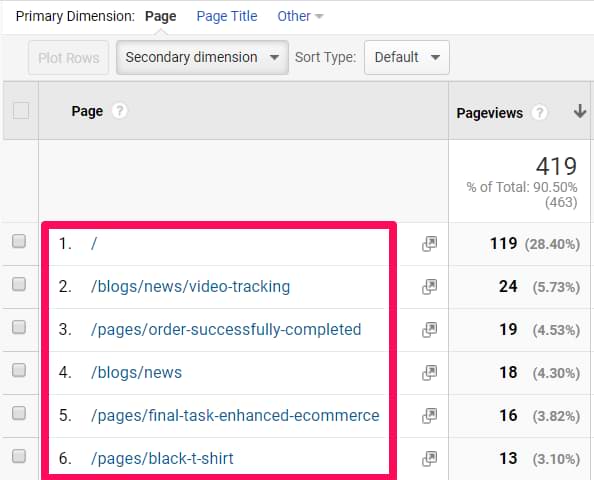 Keep an eye on how page path data is displayed in your Google Analytics reports. By default (if you haven’t modified the data, e.g., with GTM or GA filters), Google Analytics reports just the page path, e.g. /pricing or /blog/this-is-a-blog-post/.