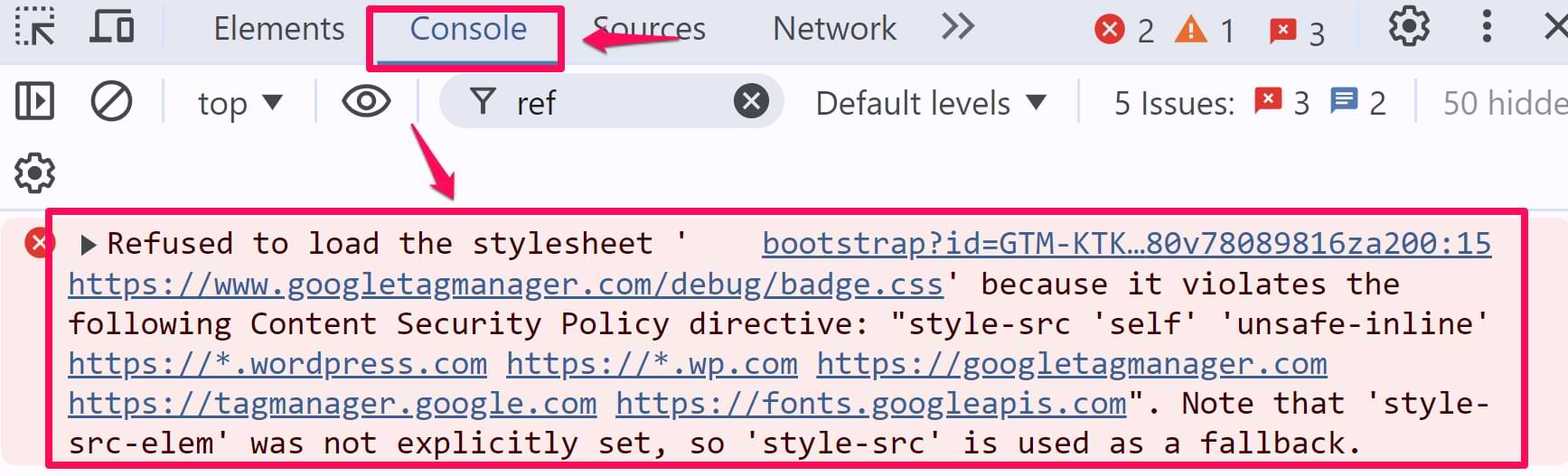 If you see something related to “Refused to load….” and “Content Security Policy”, then CSP is preventing your tags from working.