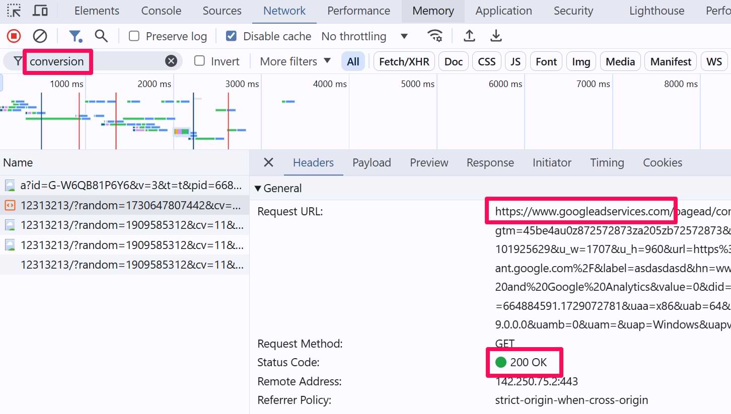 This tip applies to the Google Ads tag. If none of the above-mentioned reasons work for you, go to the browser’s developer tools > Network. While you keep them open, fire your conversion tag and check the network request.