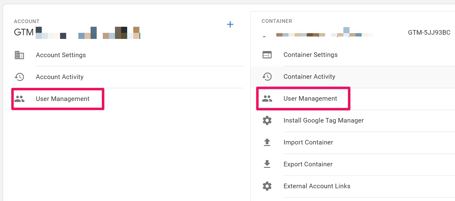 To add or modify users, click Admin in the Tag Manager menu bar, choose an account or container you need and click “User Management”. Create a new user or edit an existing user. There are four possible permissions levels each user can have access to: