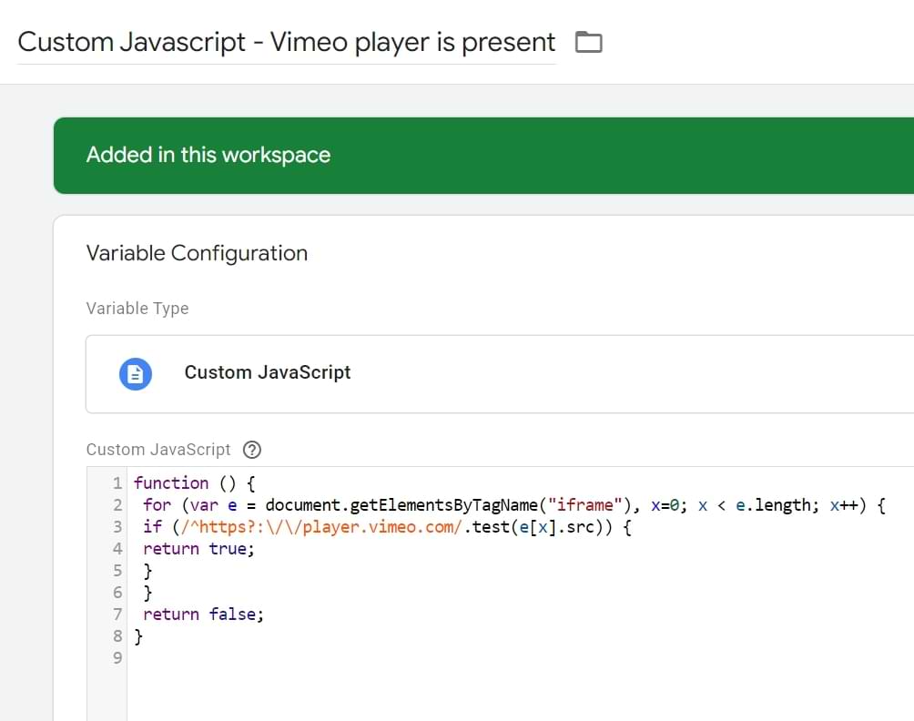 - We created a Custom JS variable that returns true if the page has a Vimeo player embedded.