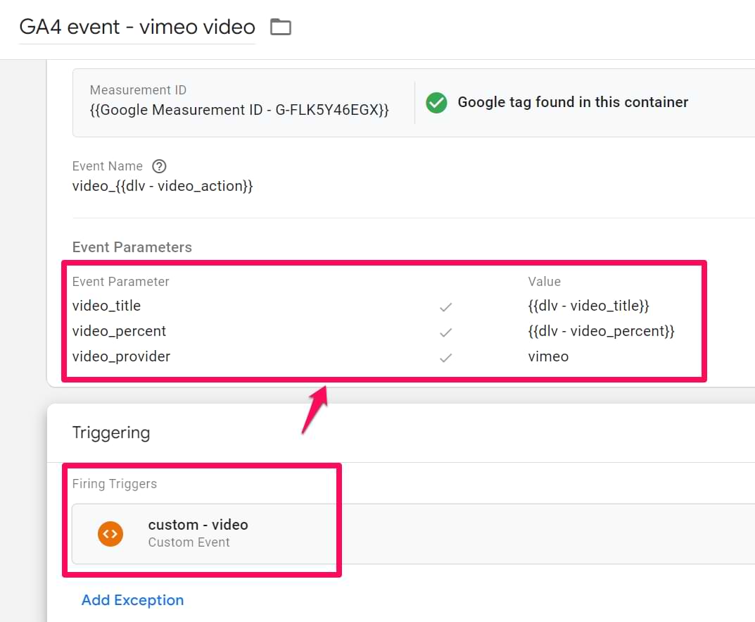 After configuring them, it’s time to create a Custom Event Trigger. Vimeo Auto-Event Listener sends all interactions as Data Layer events under “video”.