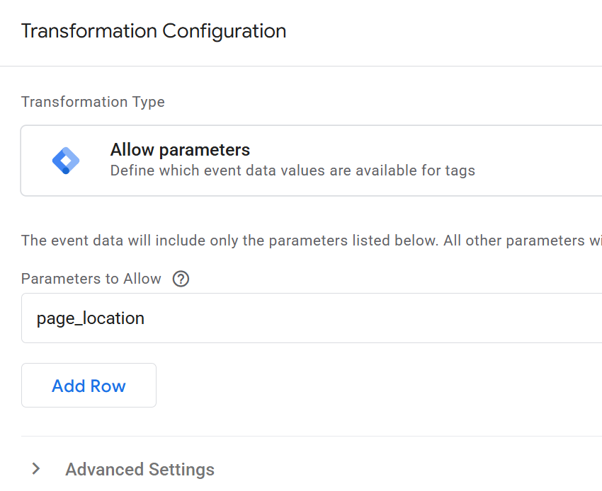 I ran an experiment by creating an “Allow parameters” transformation. As an example, I added page_location. All other parameters should be excluded.