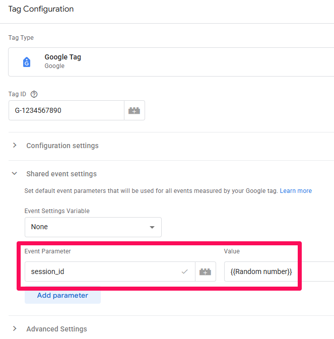 I used a built-in Random Number variable as the value. When Google Tag fires, a randomly generated value is set as session_id. As a result, all automatically tracked events (and those that were dispatched by GA4 event tags) used that session ID.