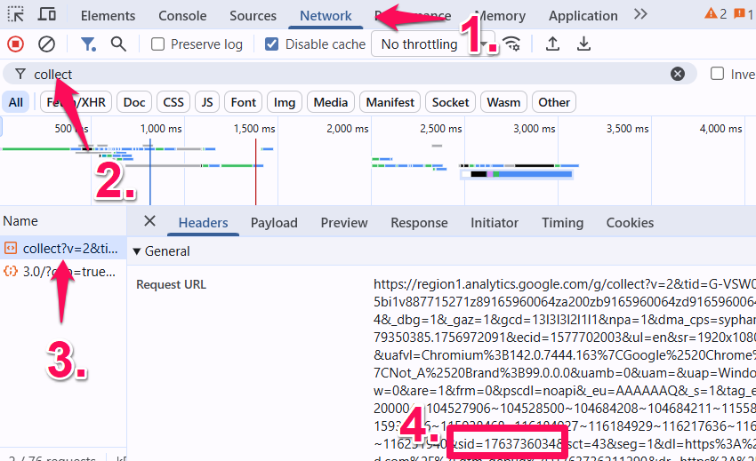 By the way, if you wonder how to check the session_id sent to Google Analytics, open the browser’s developer tools > Network. Find Google Analytics requests and check their “sid” parameter. “sid” stands for “session id”.