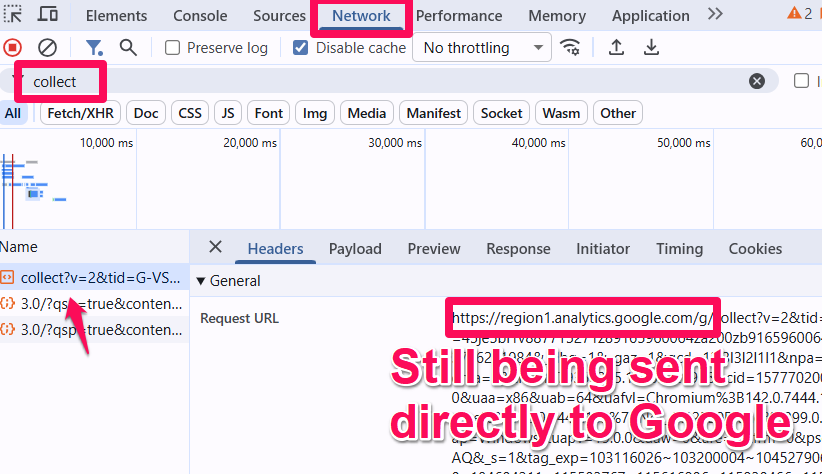 You can check this by looking at the Network tab of the browser developer tools. If the request is sent to google-analytics.com (or something similar), that’s a problem.