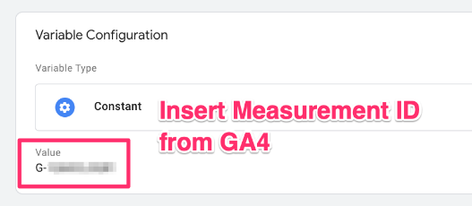 Copy the Measurement ID and paste it into the Value of the constant variable. Save your new variable as “Constant – G-XXXXXXXXXX” (or whatever makes sense to you). Read this blog post to learn more about the constant variable in Google Analytics 4.