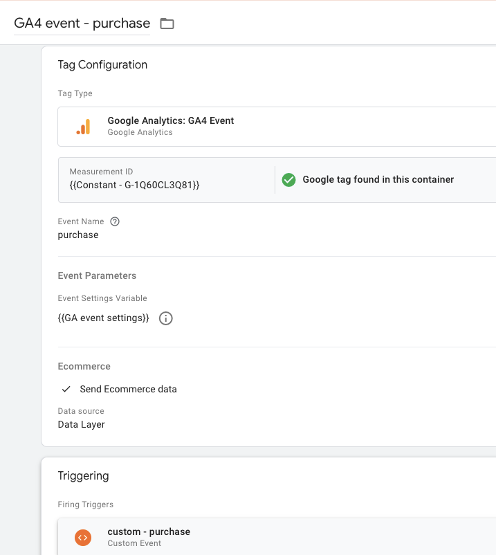 In GTM, go to the “GA4 event – purchase” tag (from before).