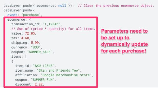 Suppose you’re using the recommended purchase event by Google (which is what we’ll be referencing in this tutorial). In that case, your developer will need to add the event into your website’s code (Data Layer) so that it fires each time a purchase is made and ensure that the event’s parameters are collecting the relevant information (e.g., the transaction and item information).