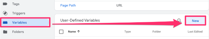 In GTM, go to Variables in the left-hand navigation and select “New” under the User-Defined Variables.