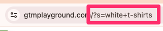 If you type a word into the search on your site, you will see that the keyword will appear in the URL, so we want to store this temporarily in a cookie. Then, when a purchase is made, we will send that keyword with the purchase event.