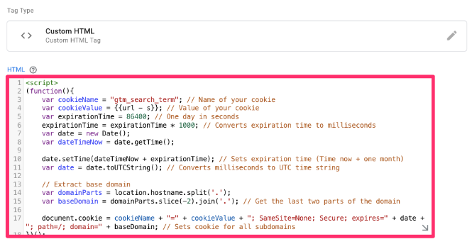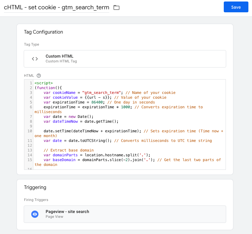Back in the tag, set the name to “cHTML – set cookie – gtm_search_term” and save.