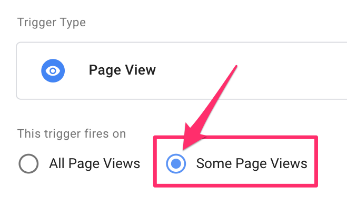 Since we want the cookie only to be triggered when the search query parameter is present in the URL, we will limit the trigger to fire on only some page views. Select “Some page views”.