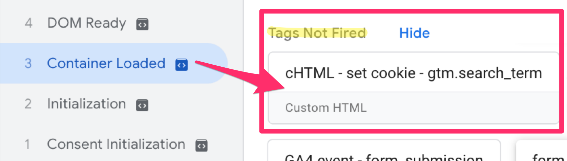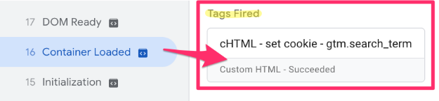 To test the cookie, you will, again, need to open Preview mode. Once your website has loaded, check that the cHTML tag didn’t fire on the first page that opens (since there is no site search query parameter in the URL).