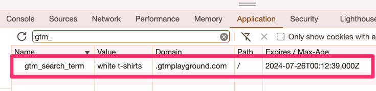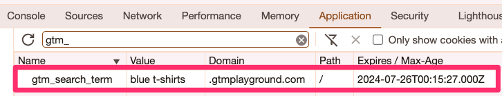 In the search box, type “gtm_” to find the gtm_search_term cookie (or whatever you decided to name the cookie). The Value will collect the keyword that you searched.