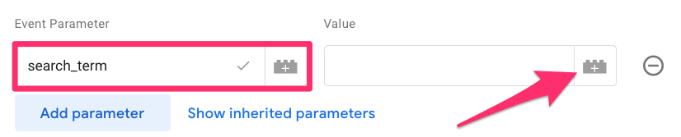 Under the Event parameters, add a parameter with the name exactly matching “search_term” (a standard parameter that GA4 recognizes). Click the “+” at the end of the row to create a new variable to hold the value of the search term cookie.