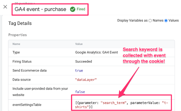 - Check the purchase event in Preview mode to confirm that the tag was fired and that the search term and other parameters (from the purchase event) have been collected.