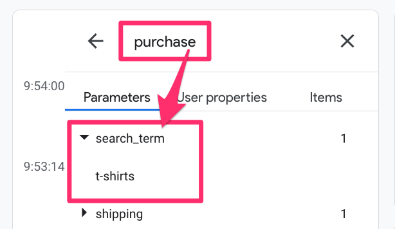 - Check the same information in GA4 DebugView to confirm that the event (and its information) has been collected. In the DebugView tool, click on the event and go to the Parameters tab to find the search_term.