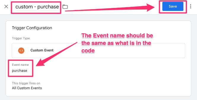 In the Event name textbox, enter purchase. Name the trigger “custom – purchase” and save.