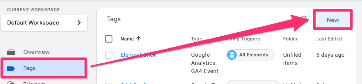 In GTM, go to Tags in the left-side navigation and click “New”.