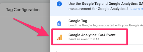 For the Tag Configuration, select Google Analytics > GA4 Event.